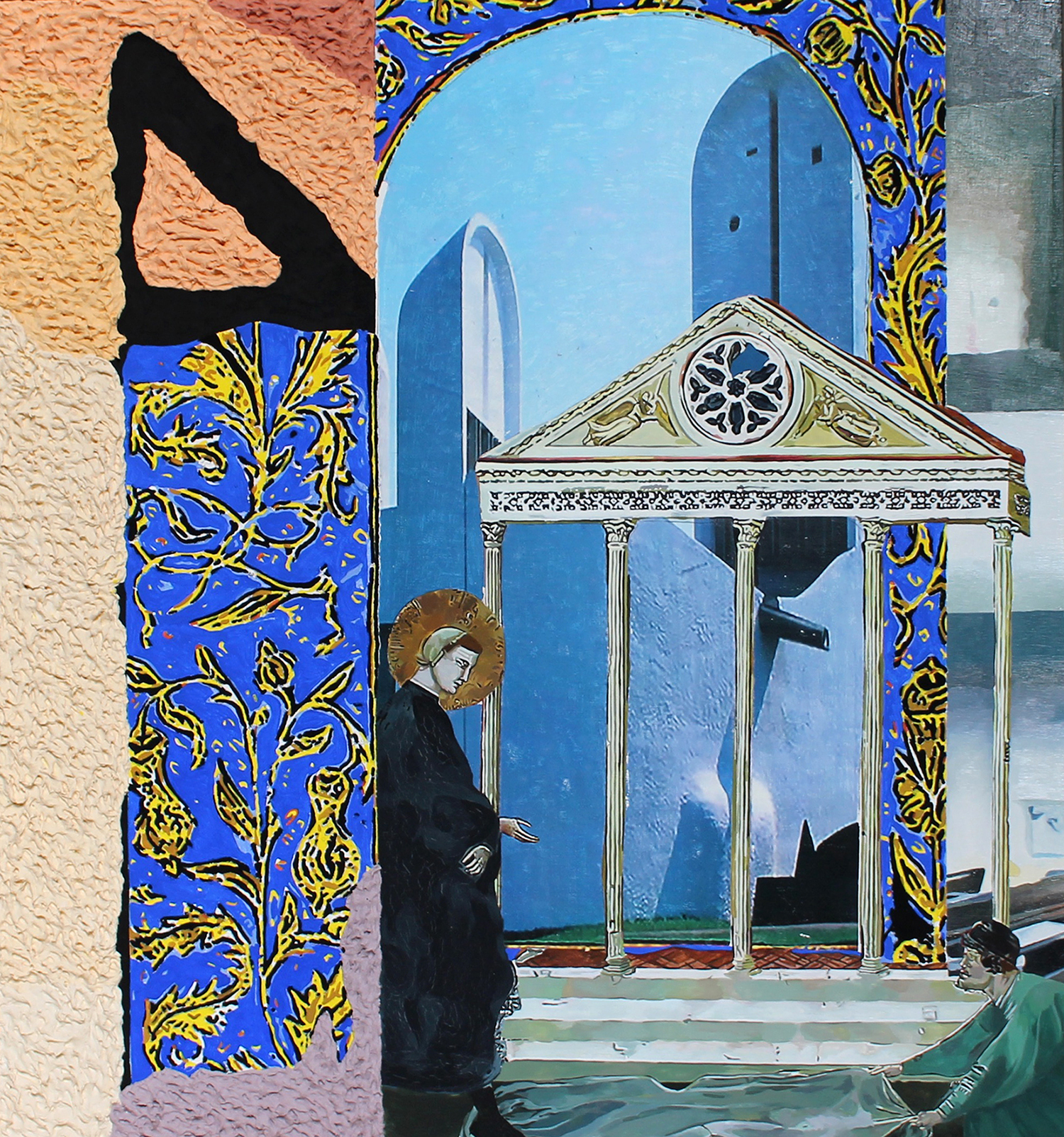 peinture à l’huile, enduit teinté, transfert et gouache sur médium anthracite